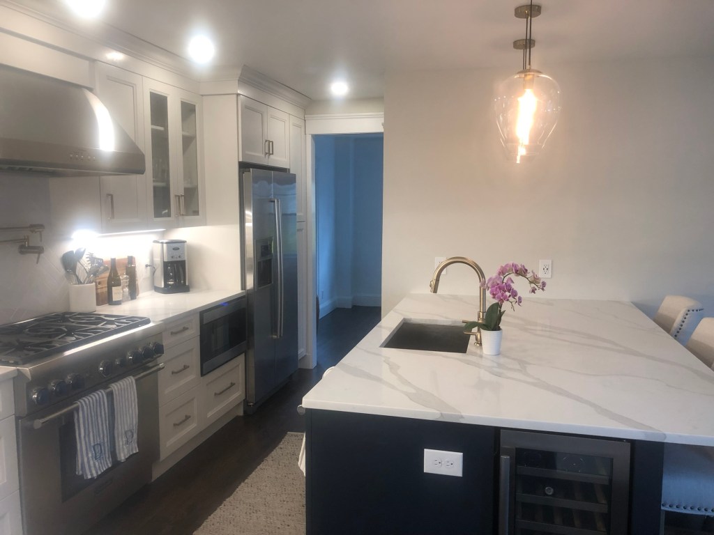 To create this open space kitchen we removed a dividing wall, matched the hardwood floors that were pre existing, relocating all plumbing, a toe heater concealed in the base of the wash basin cabinet. All new appliances including a wine fridge built into the island,